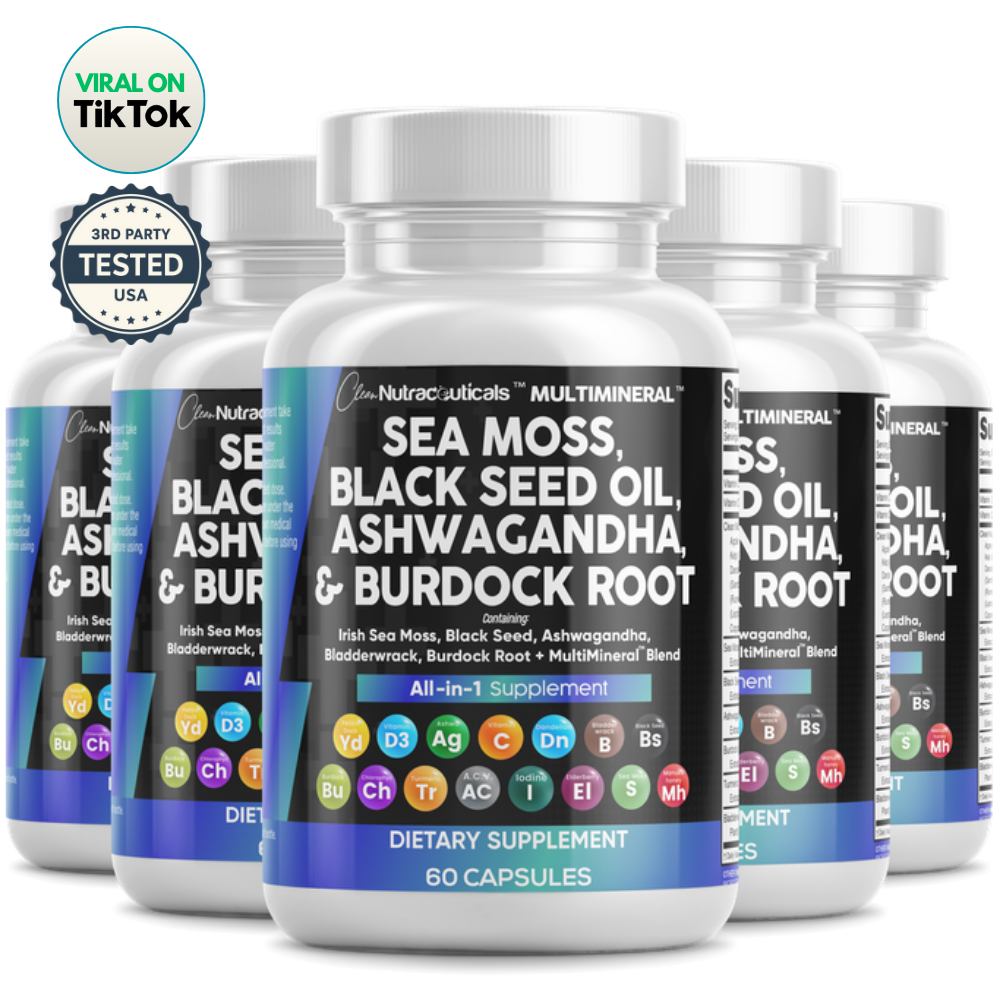 Multimineral contains 15 premium ingredients: Irish Sea Moss, Black Seed Oil, Ashwagandha, Burdock Root, Elderberry, Dandelion, Vitamin C, Vitamin D3, Bladderwrack, Turmeric, Chlorophyll, Manuka Honey, Yellow Dock, Apple Cider Vinegar, and Iodine.