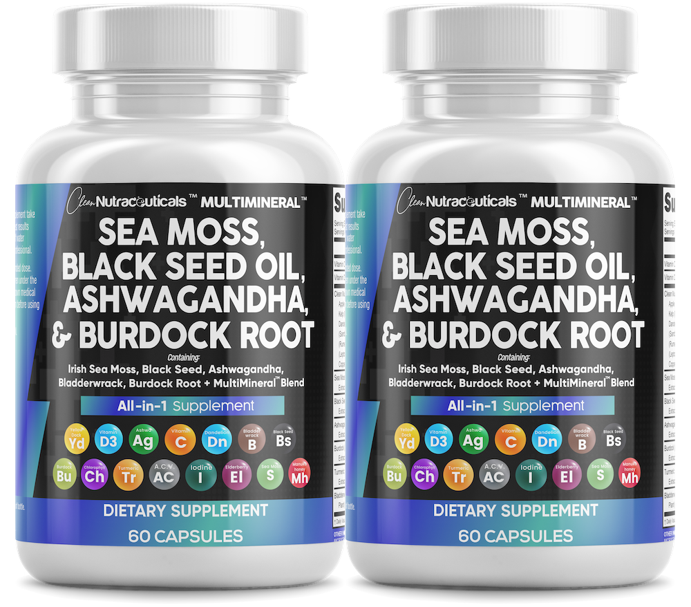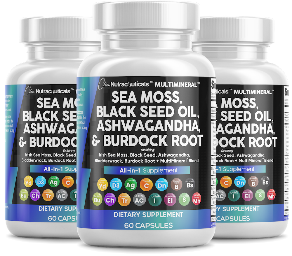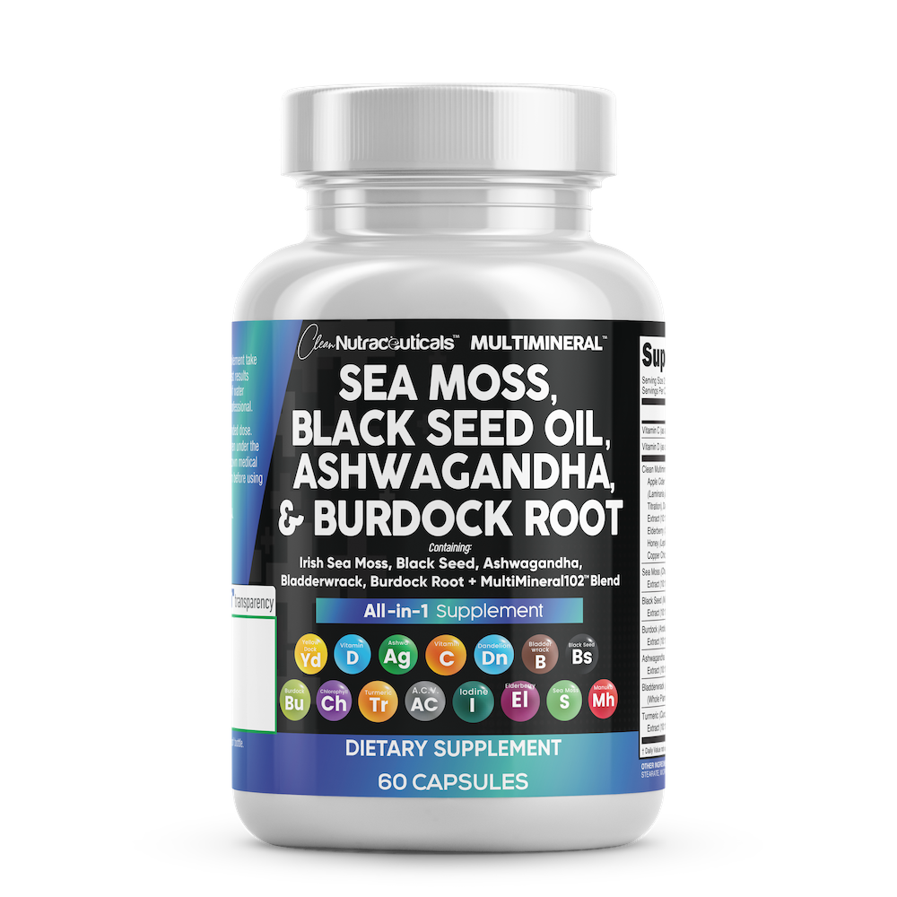 Multimineral contains 15 premium ingredients: Irish Sea Moss, Black Seed Oil, Ashwagandha, Burdock Root, Elderberry, Dandelion, Vitamin C, Vitamin D3, Bladderwrack, Turmeric, Chlorophyll, Manuka Honey, Yellow Dock, Apple Cider Vinegar, and Iodine.